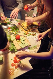 Dann geht es los! Es wird gefeilscht, getauscht, bestrichen, gerüstet, geschnitten gebracht, geholt und belegt. Nach drei Minuten lautstarkem Chaos türmt sich auf jedem Tisch ein prächtiges Social-Muscle-Club-Sandwich. Bissfreudig, schmatzend und fingerleckend isst sich die Gruppe ihren Magen sozial.